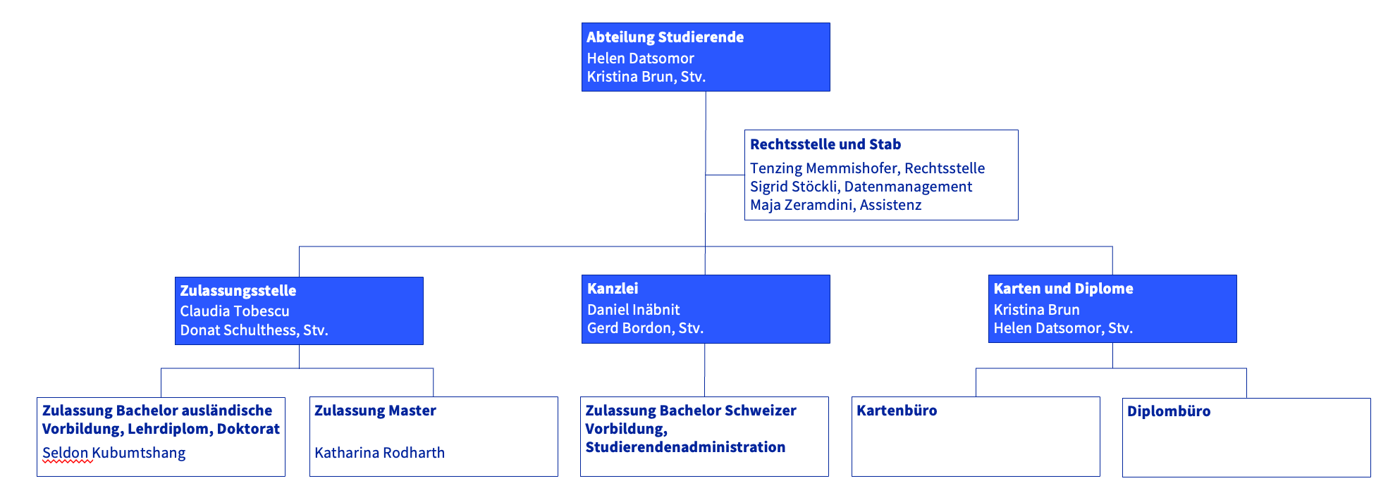 Die Abteilung Studierende ist für alle zentral organisierten Prozesse der Studierendenverwaltung an der UZH wie Zulassung, Studiengangs- und Studienprogrammwechsel, Erhebung der Semestergebühren, Diplomdruck, Ausstellung der UZH Card, Urlaub und Exmatrikulation zuständig.