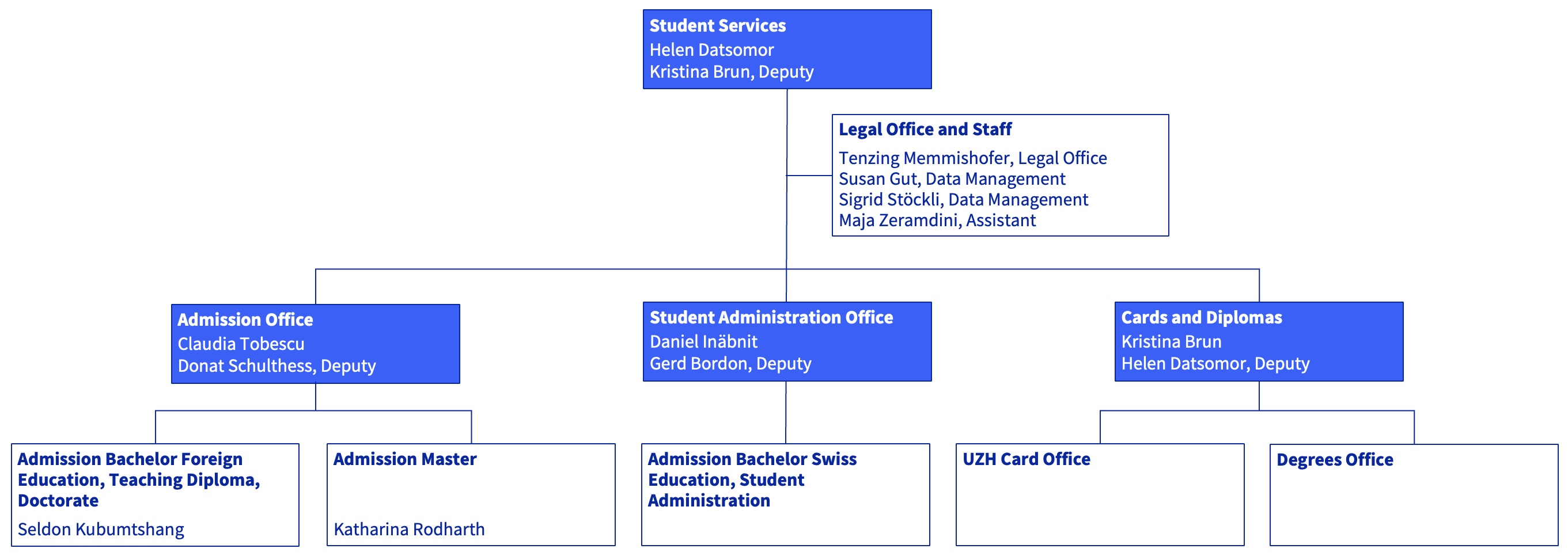 Student Services is responsible for all centrally organized student administration processes at UZH, such as admission, change of study program, semester fees, print of diplomas, issuing the UZH Card, leave of absence and withdrawal from the university.